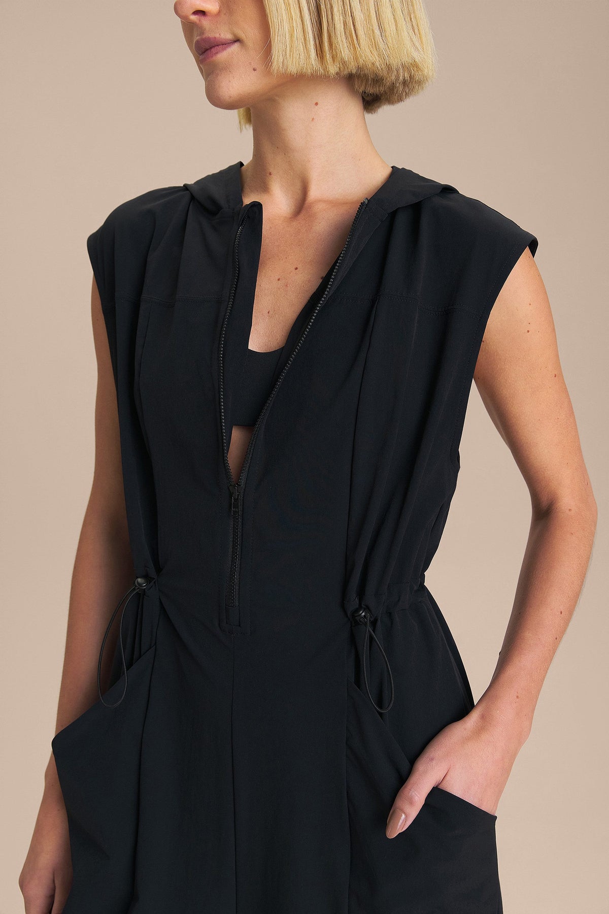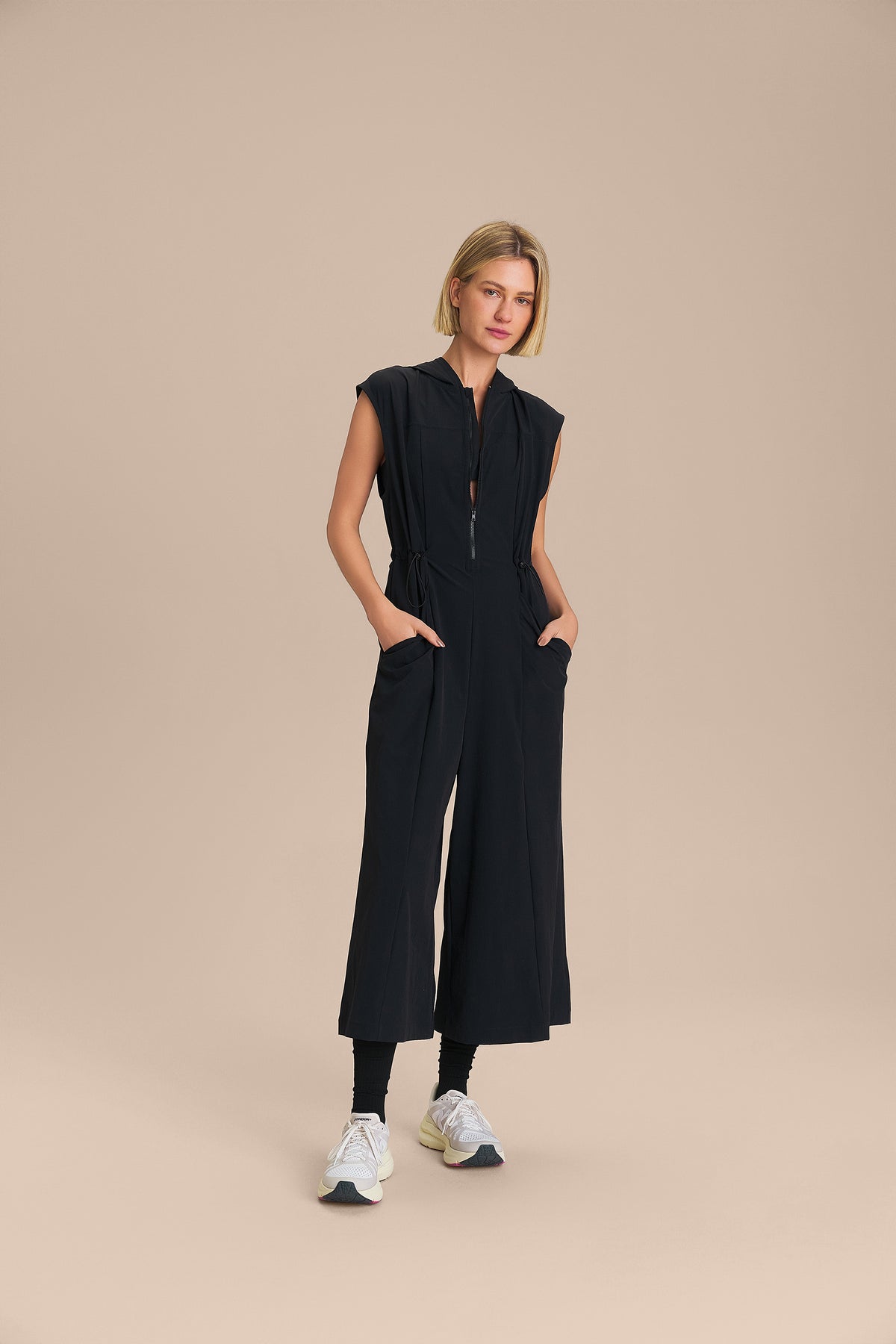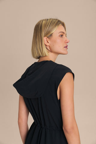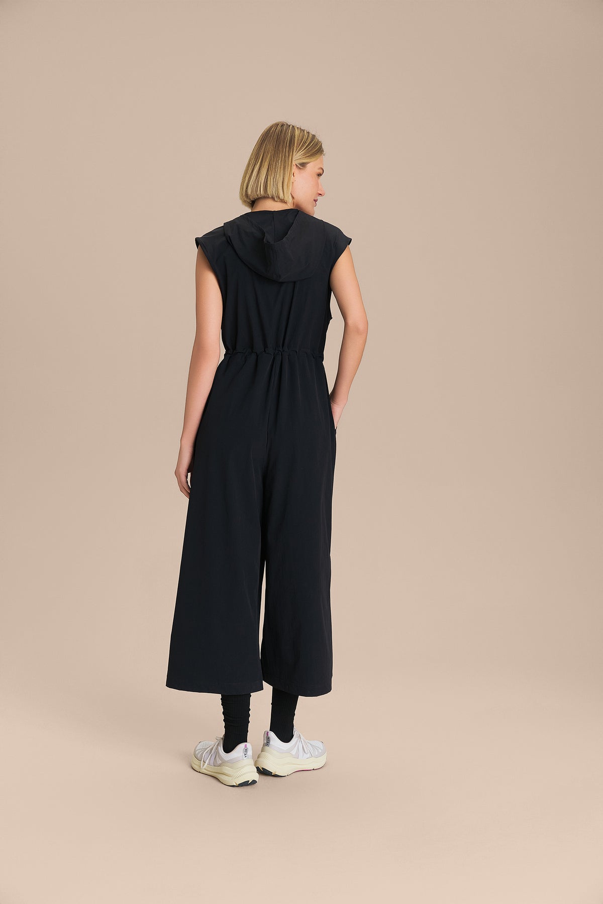 The Midi Jumpsuit features a relaxed fit at the shoulders and a cinched waist with an elastic band and drawstring, enhancing the silhouette with elegance. The hood and front zipper add a contemporary touch to the design, while the strategic cut lines provide a refined drape and the functional side pockets offer practicality for storing small essentials. Made from a lightly structured woven fabric, it features Quick Dry technology for faster drying and Easy Care technology for effortless daily maintenance.