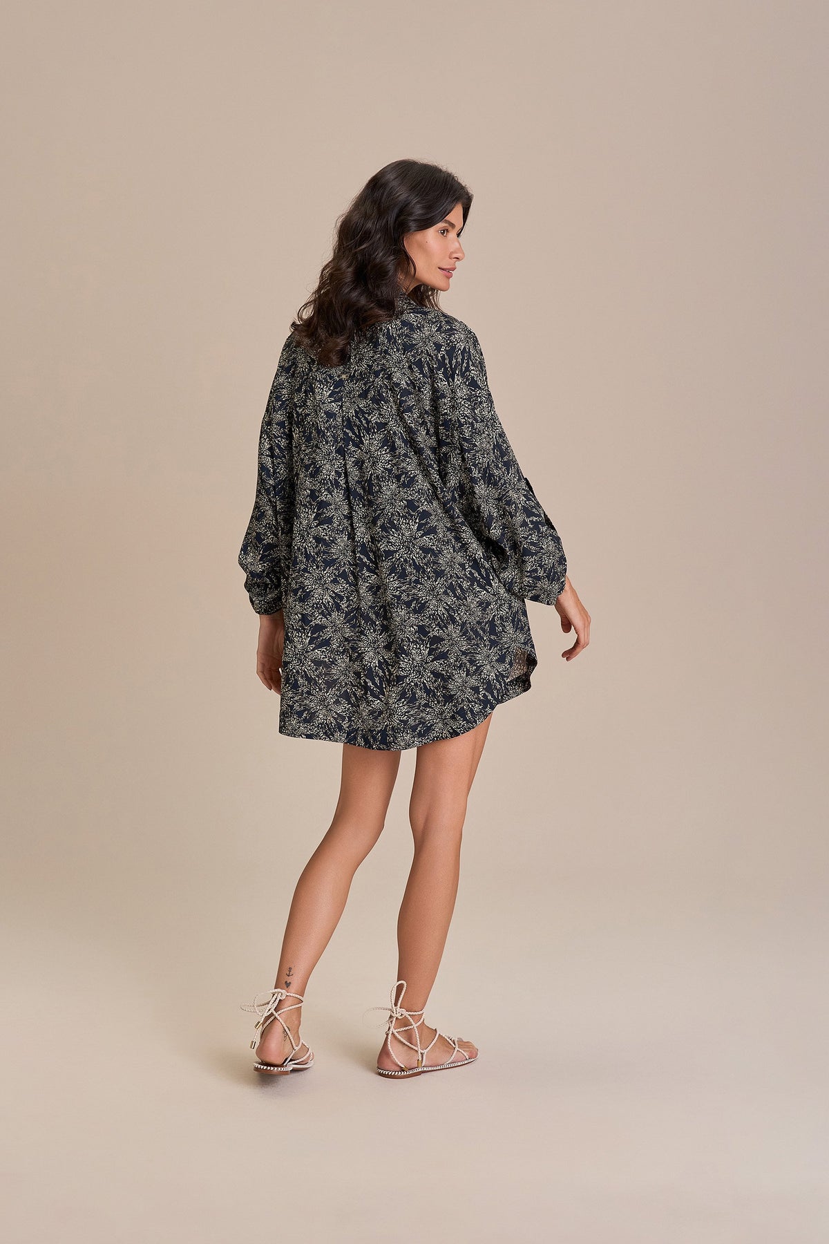 Its loose fit, with dropped armholes and adjustable sleeves with martingale, ensures comfort and practicality. The rounded hem and pleat detail on the back add movement and lightness to the piece, while the charming collar with a tie option gives it an elegant yet relaxed touch.