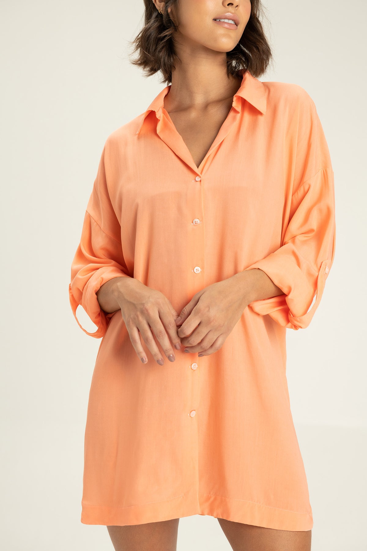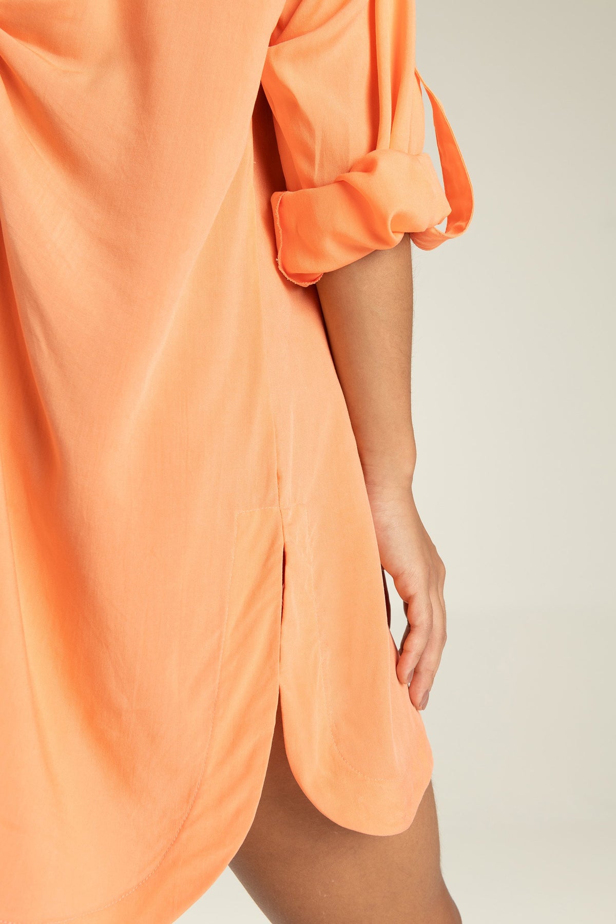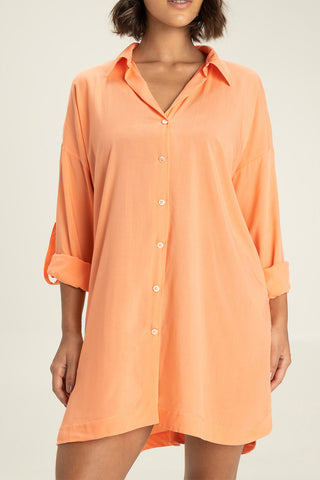 The chemise keeps you stylish on your beach outings beyond the sands! It can be worn open for a loose fit or closed, offering versatile styling options. Its traditional shape features a modern open-back design and the option to adjust sleeve length with a button strap. Made from Viscose Light fabric, it has a lightweight drape and soft touch.