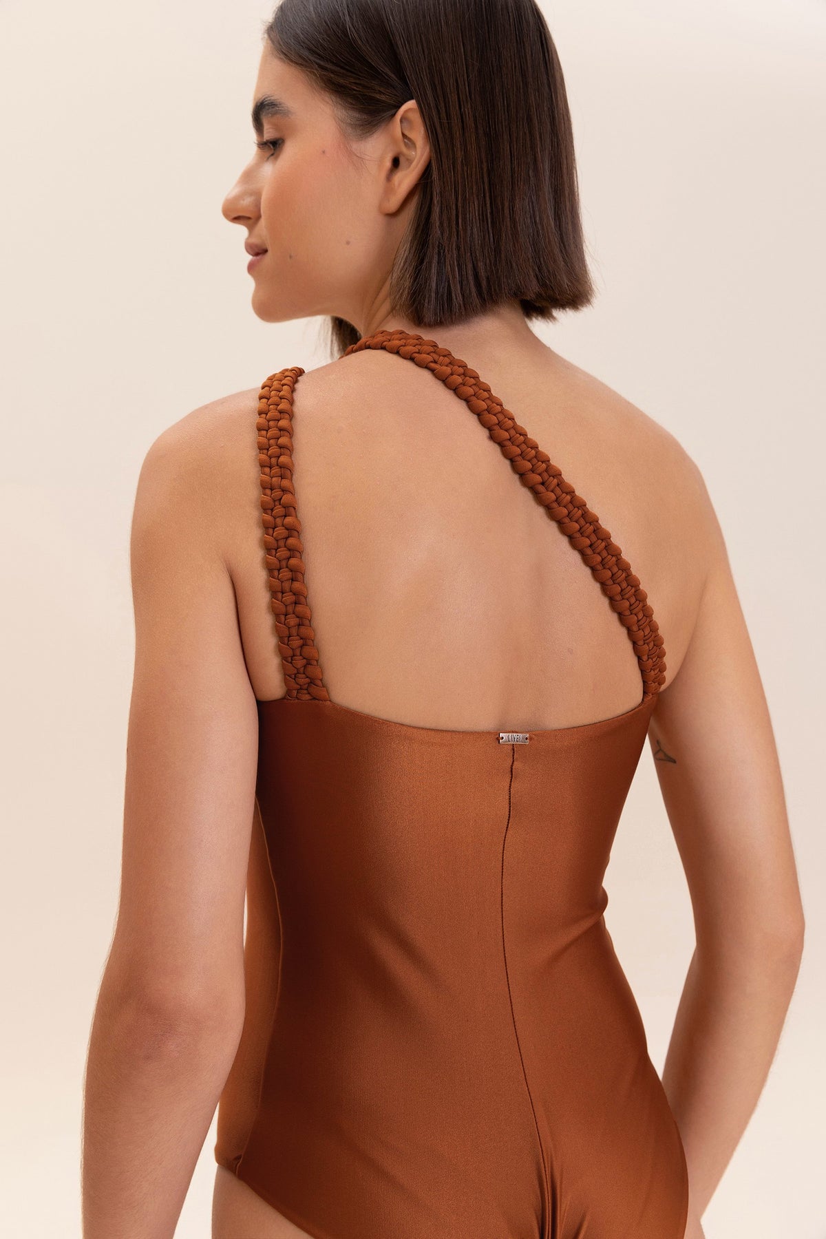 The one-shoulder swimsuit makes you more fashionable in the summer! The asymmetrical neckline stands out with its innovative design, featuring a maxi keyhole and a strap detail made of macramé. Its anatomical fit enhances the curves.