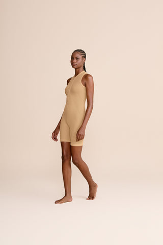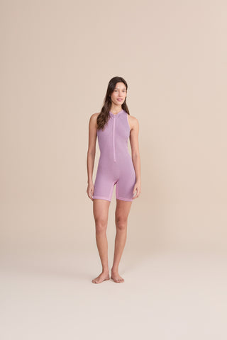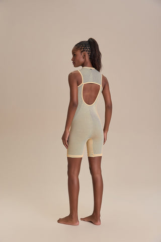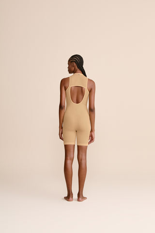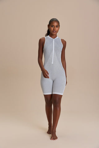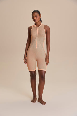The Short-Length Jumpsuit is made with Seamless technology, eliminating traditional seams for improved comfort and mobility. The front zipper closure makes it easy to put on, while the open back with an elongated cutout enhances the silhouette with sophistication. Crafted from heathered yarn, it ensures reliable coverage and prevents sheerness. The anatomical gusset improves fit and supports unrestricted movement. With medium compression, it features diagonal graphic textures that sculpt the body with style. Unlined, it offers a natural fit and lasting comfort.