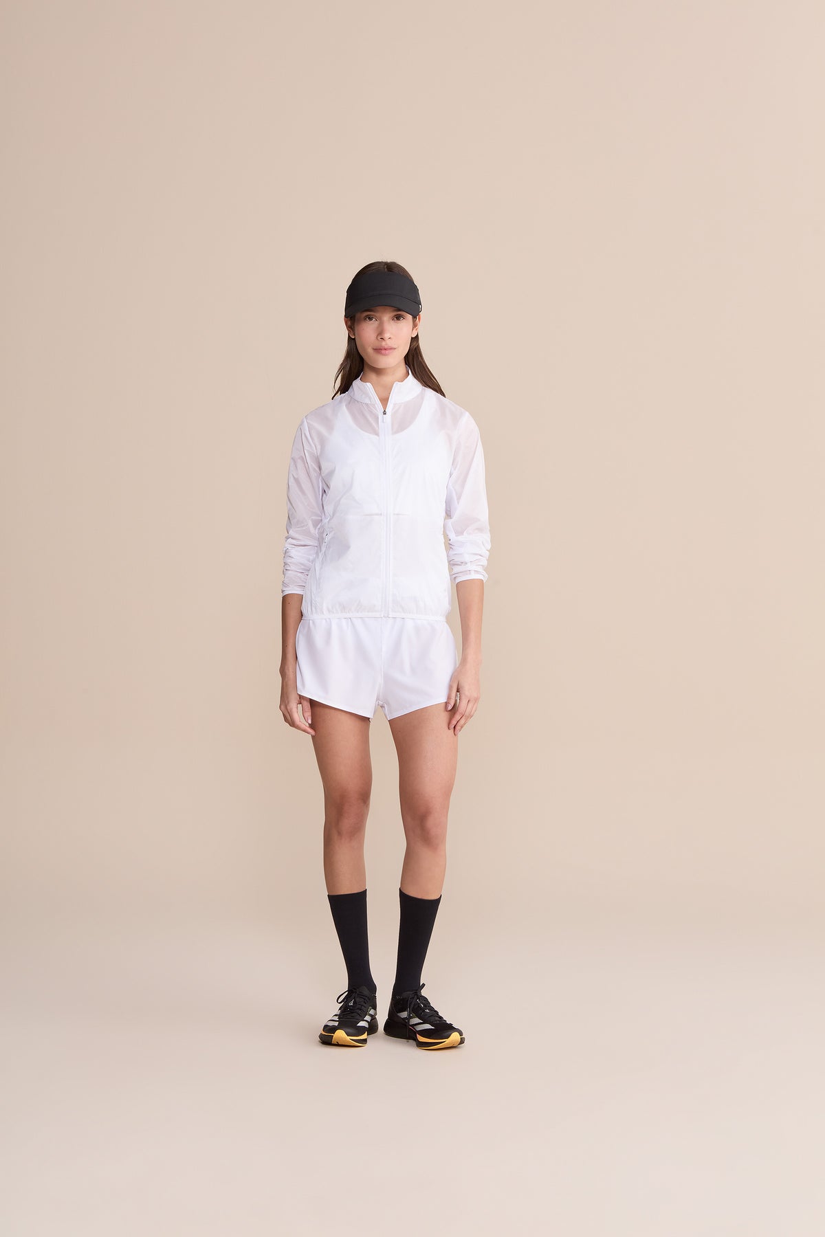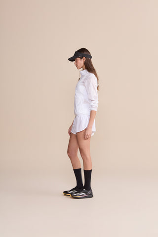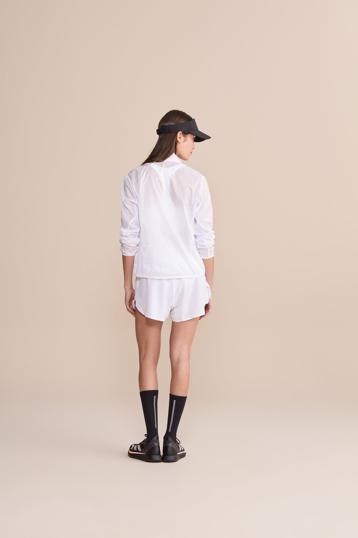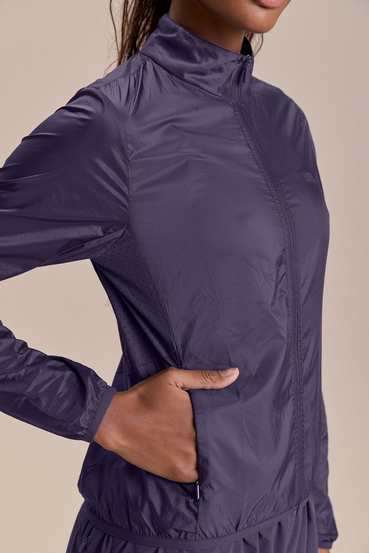 Women’s lightweight windbreaker designed to support high-performance training with functional, streamlined construction. A high collar and full-length front zipper provide coverage, while strategic paneling with a mix of fabrics enhances comfort and freedom of movement. Reflective detailing at the back improves visibility in low-light conditions, and zippered front pockets offer secure storage for essentials. Crafted from lightweight, water-resistant fabric to provide protection during outdoor activities across changing weather conditions.