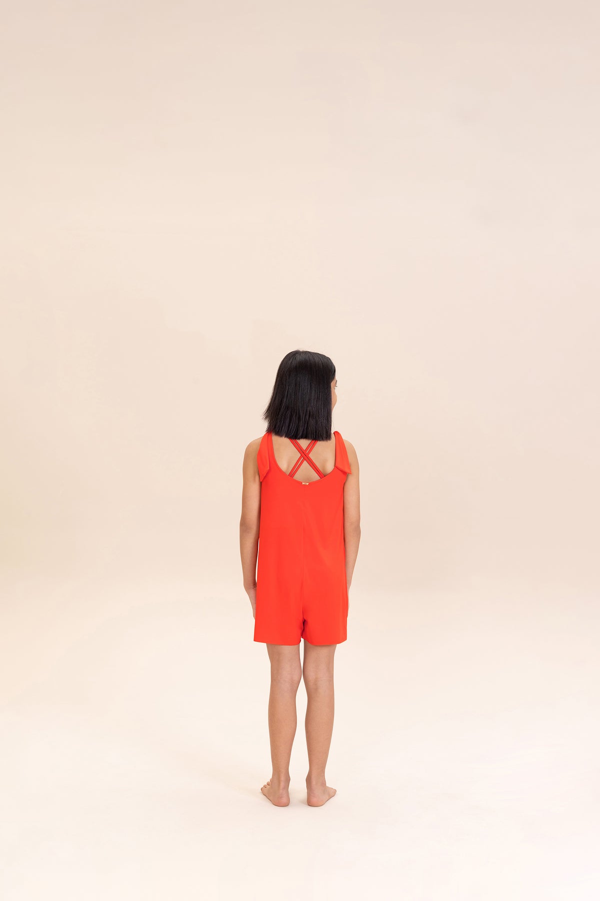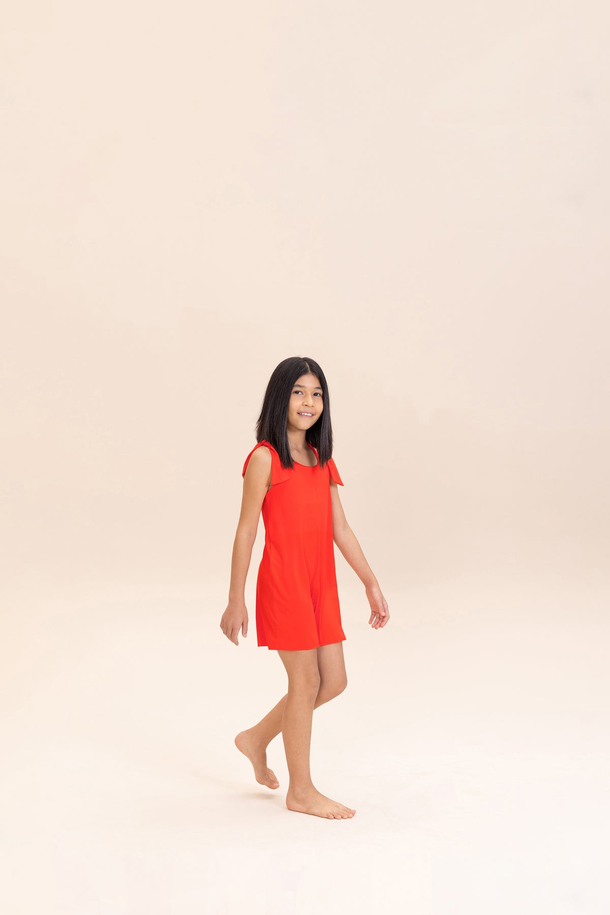 The jumpsuit is extremely comfortable for your daughter during summer days! Its short length and slightly loose fit provide freedom of movement.