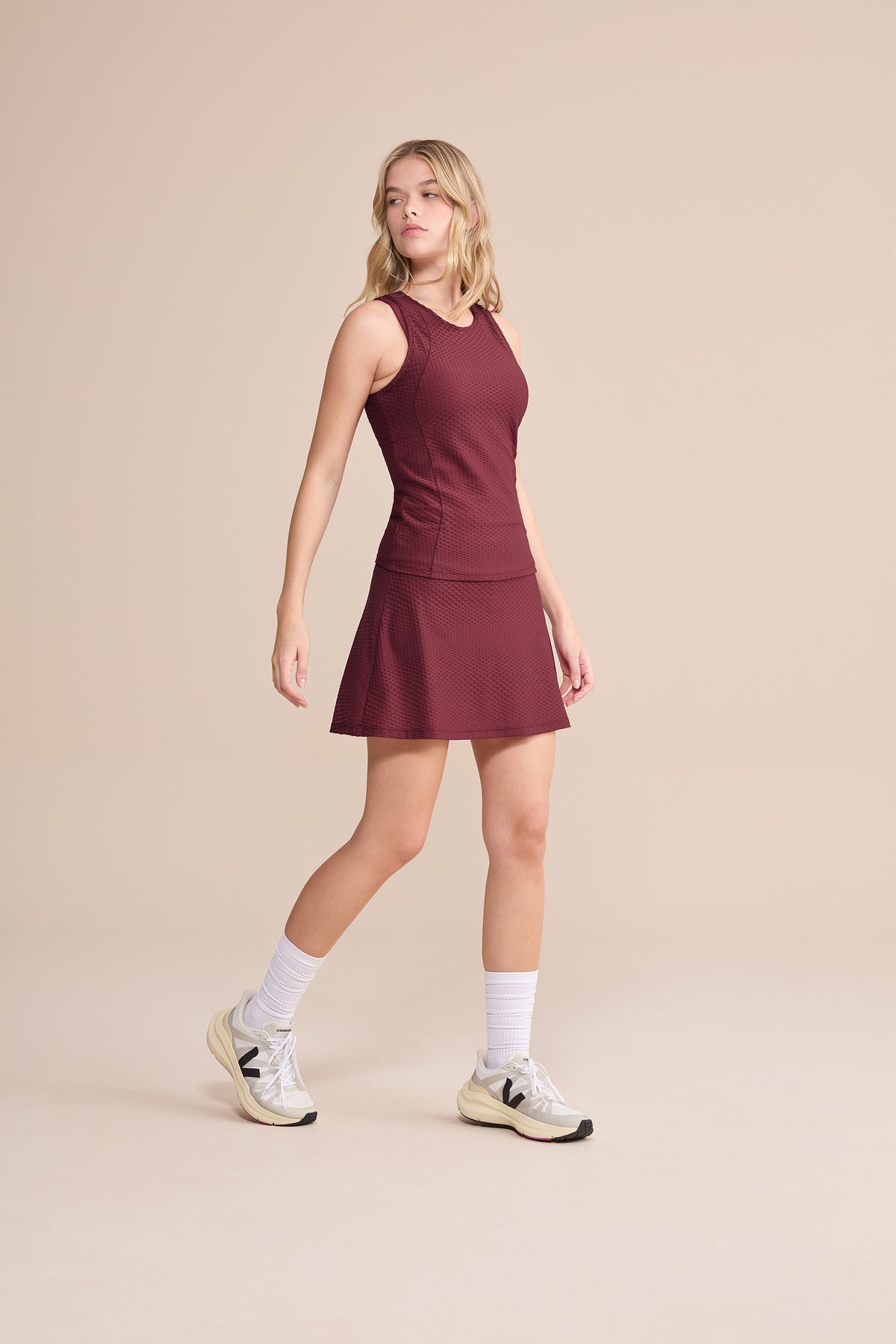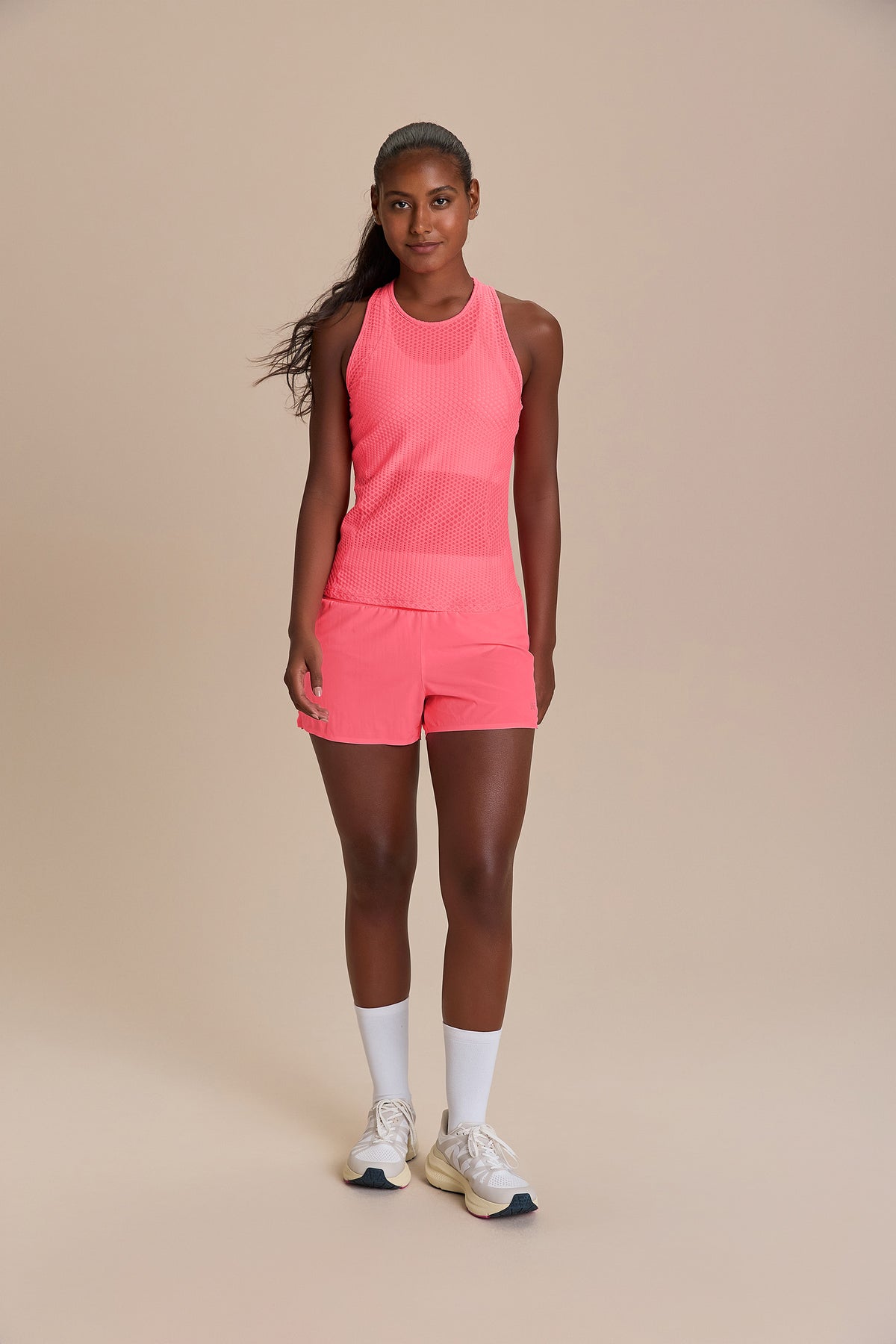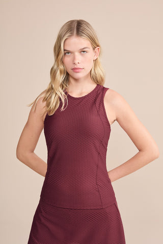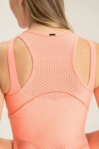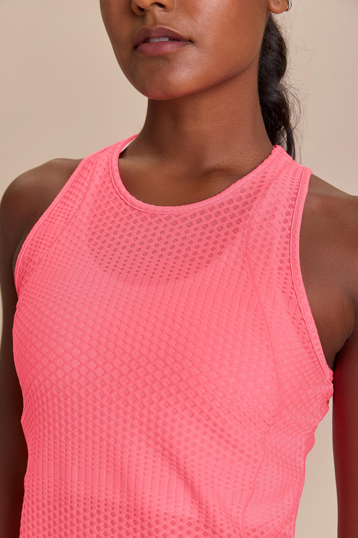 Lightweight performance tank designed for comfort and versatility during light to moderate workouts. Features an anatomical design with a racerback neckline and a lightly body-skimming fit, supported by strategic seam placement to enhance freedom of movement. The textured fabric surface improves breathability during training, while Quick Dry technology helps keep the body dry. Easy Care properties support low-maintenance, everyday wear.