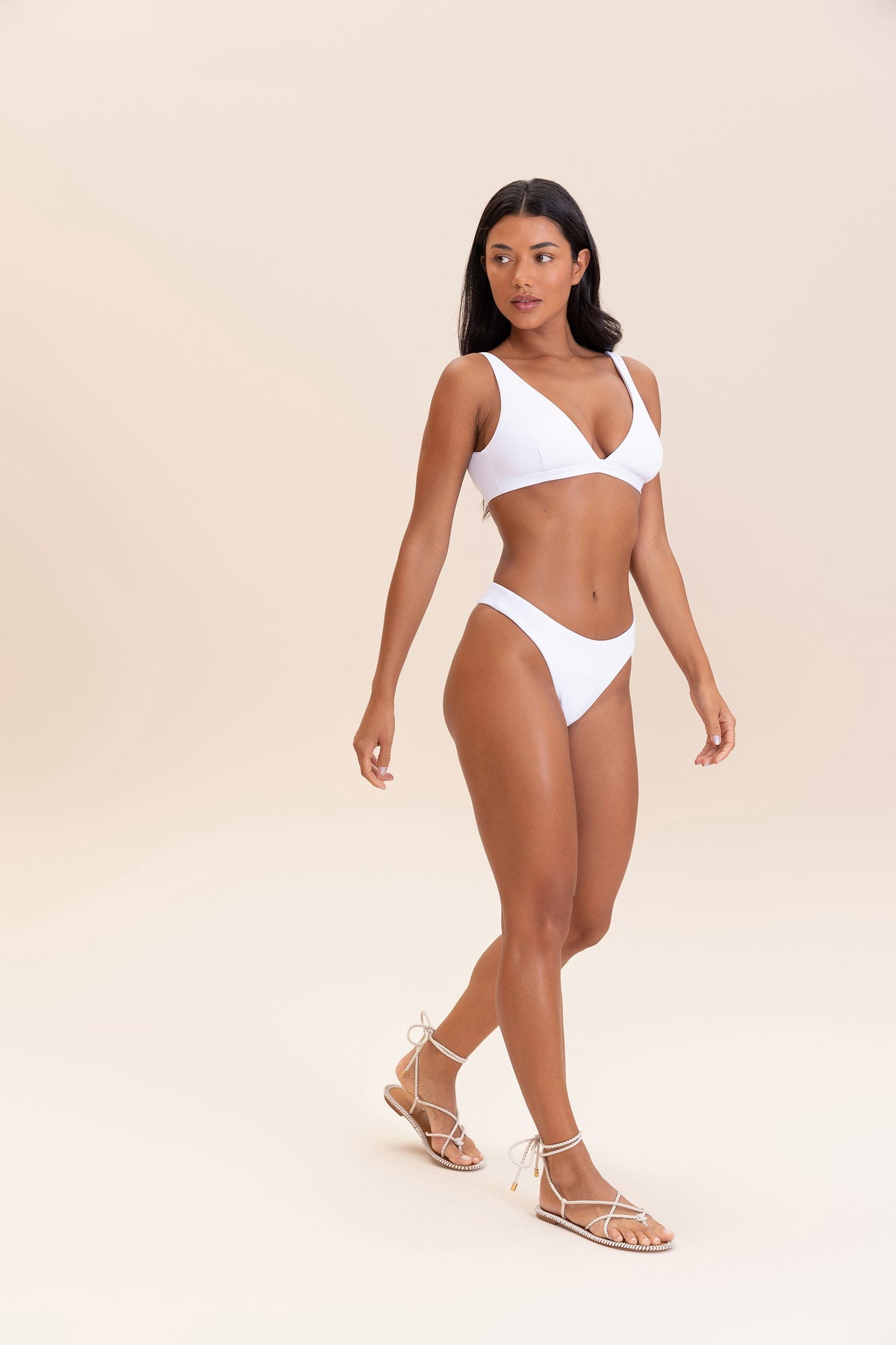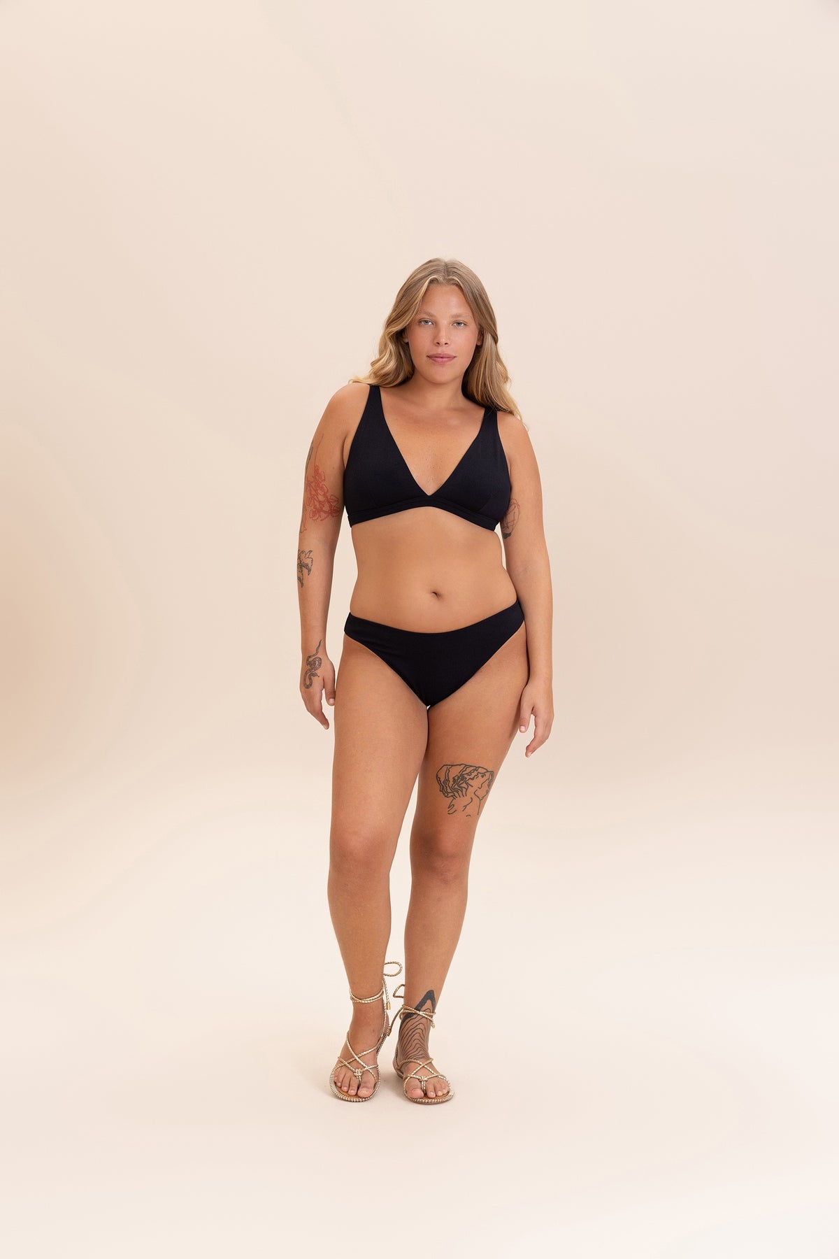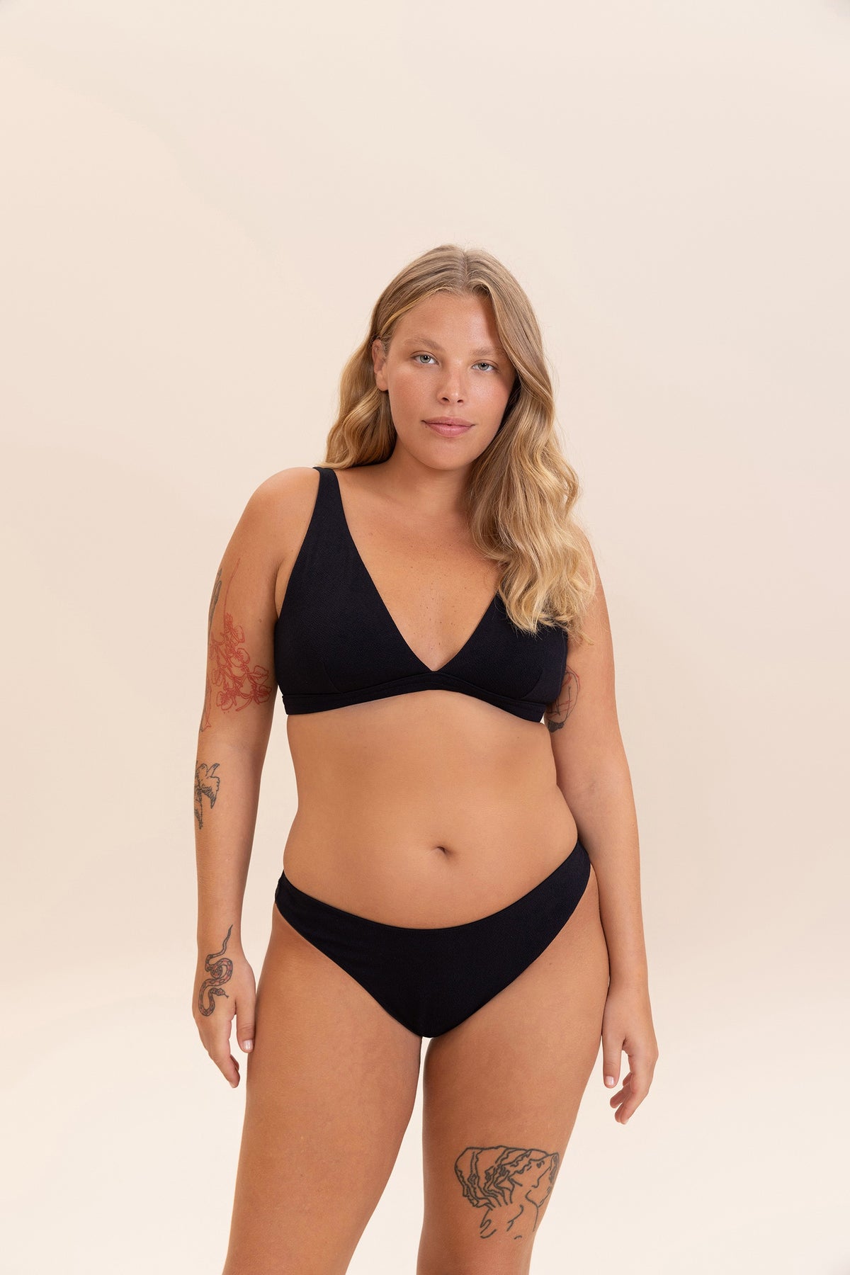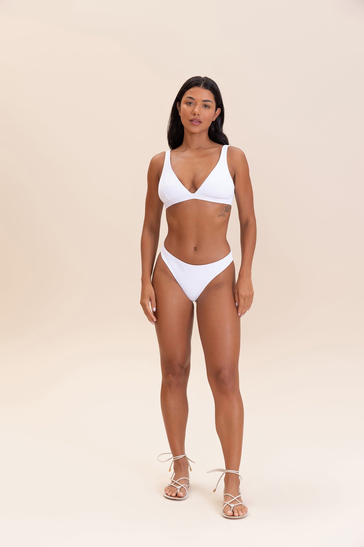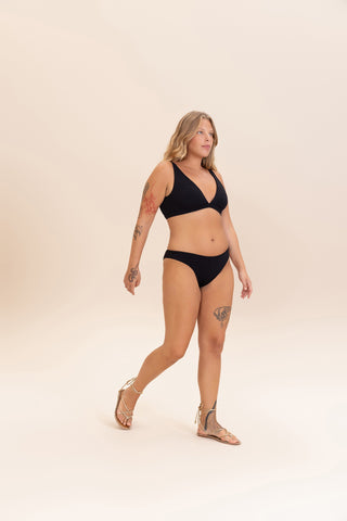 The bikini bottom is classic. With medium side straps, it allows for adjustment to different body types, offering maximum comfort and security. Strategically placed seams and high-coverage lining prevent discomfort and transparency during use. Its design can also be worn by pregnant women, adapting to the body during pregnancy. With a textured surface and a soft touch, it provides a contemporary and laid-back look, along with UPF50+ protection technology.