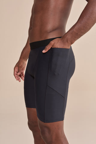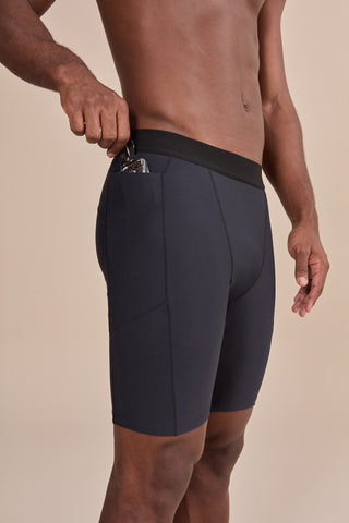 High-compression shorts with anatomical cutouts and functional pockets. Made in Brazil.