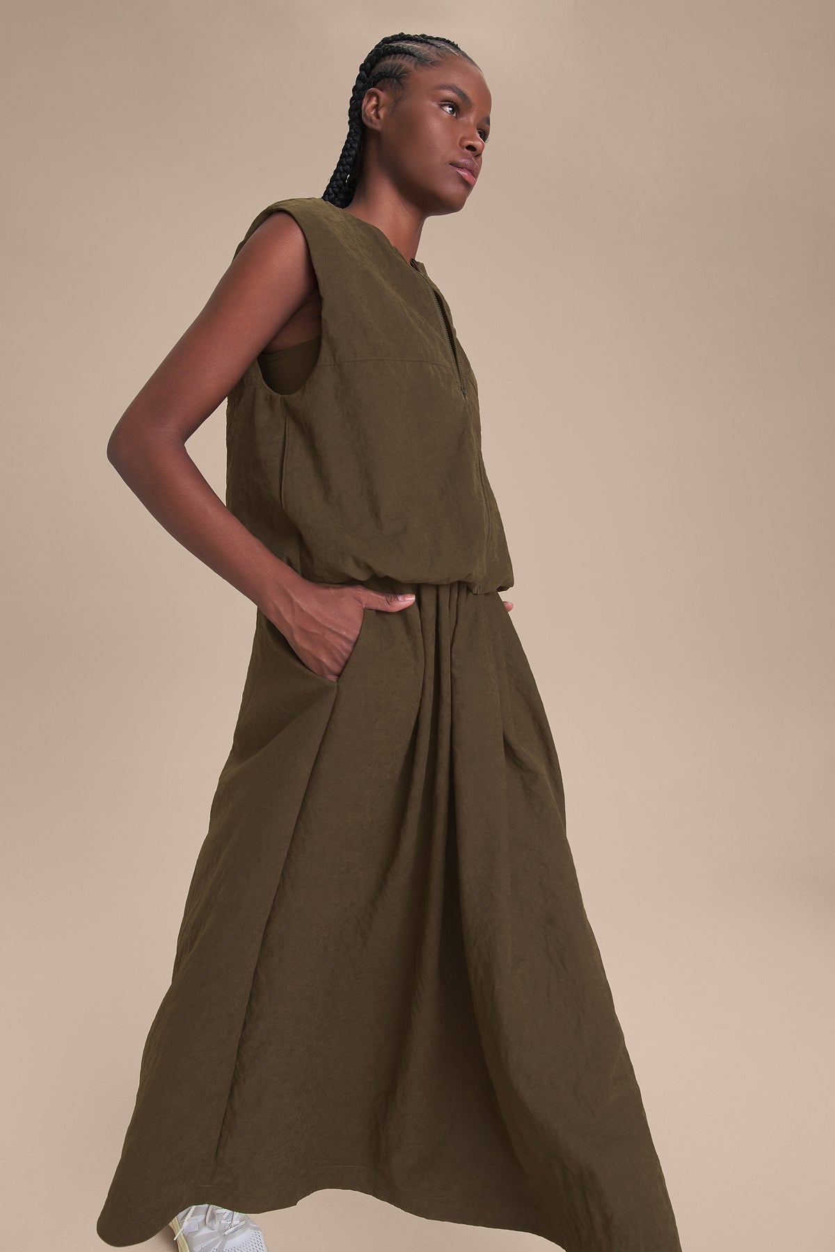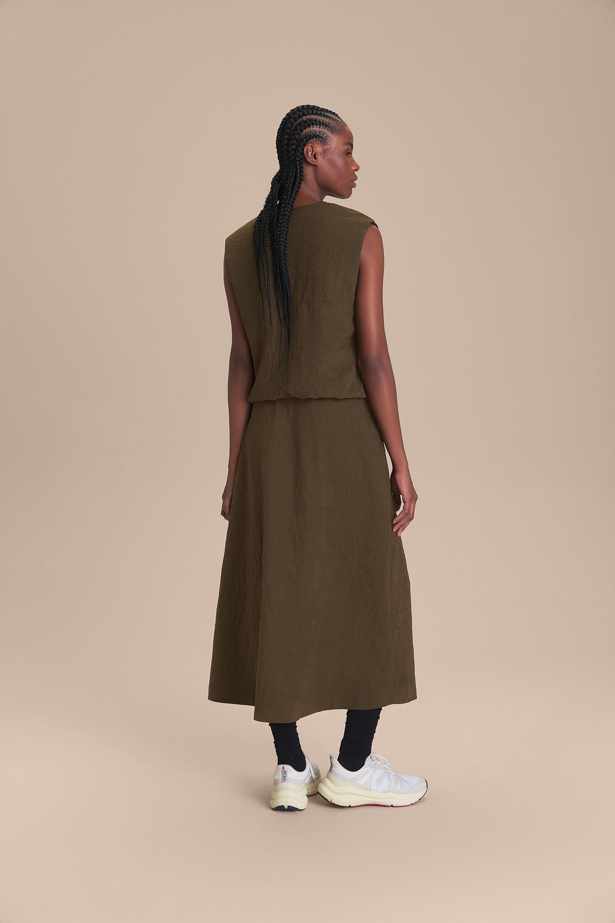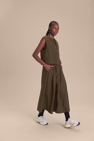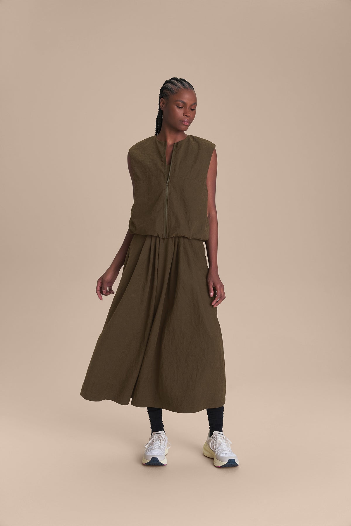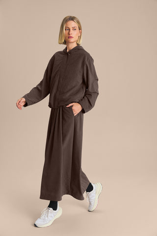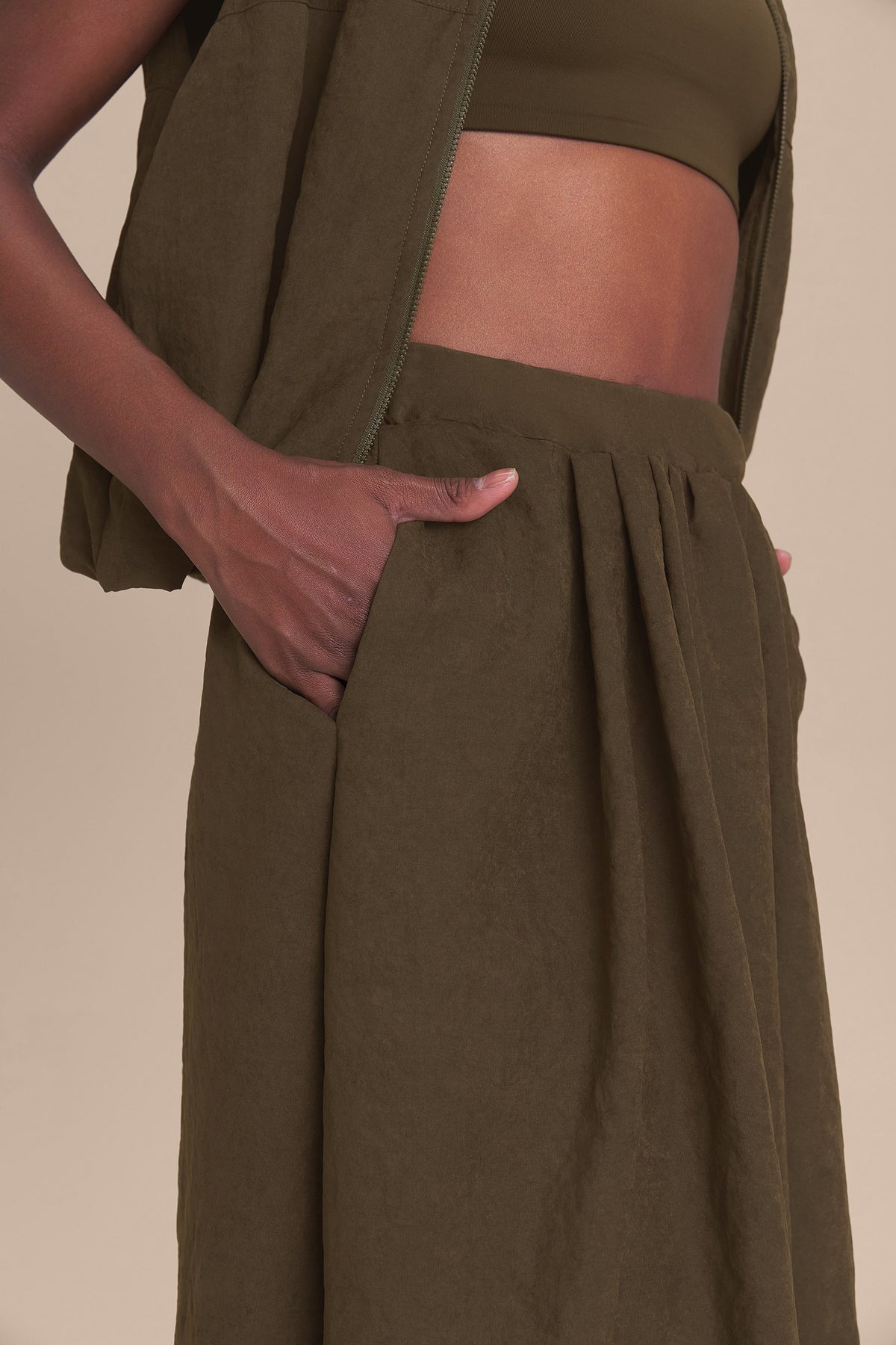 The Midi Skirt features front pleats that add movement and a touch of elegance to the look. The elastic waistband provides a comfortable fit, while the functional side pockets offer practicality for carrying small daily essentials. Crafted from a woven fabric with a velvety touch, it has a subtly crinkled appearance and a structured drape, combining comfort with contemporary style.