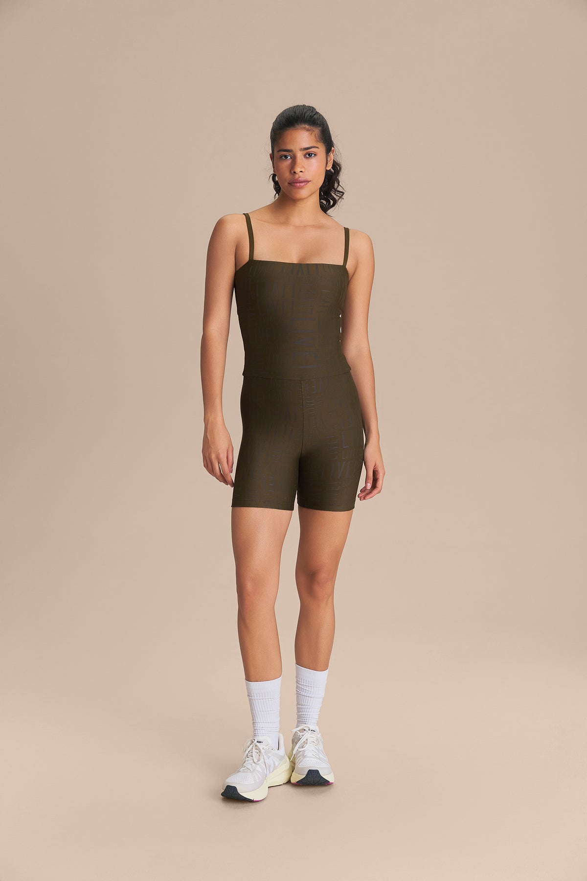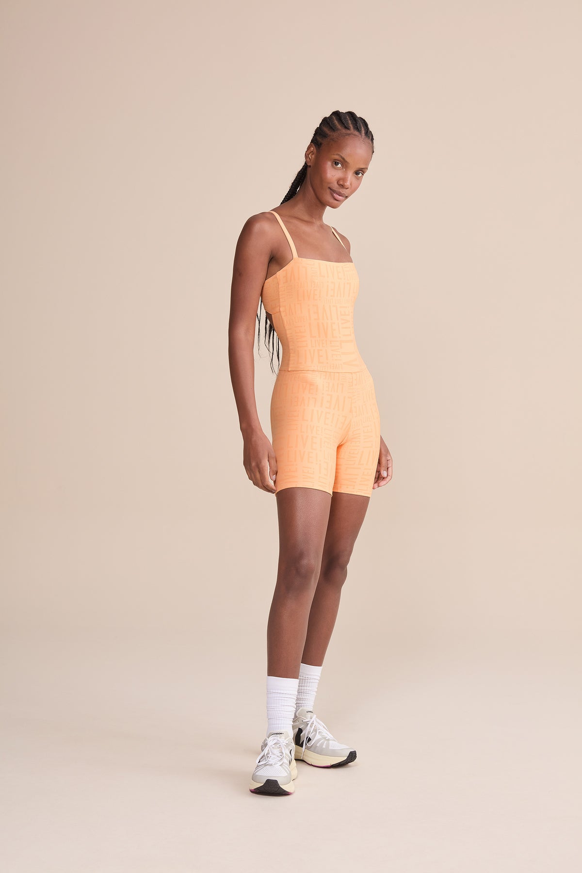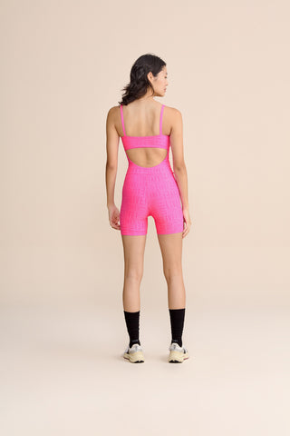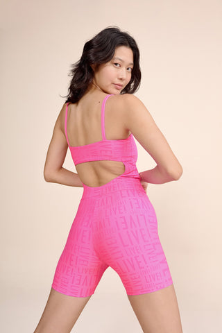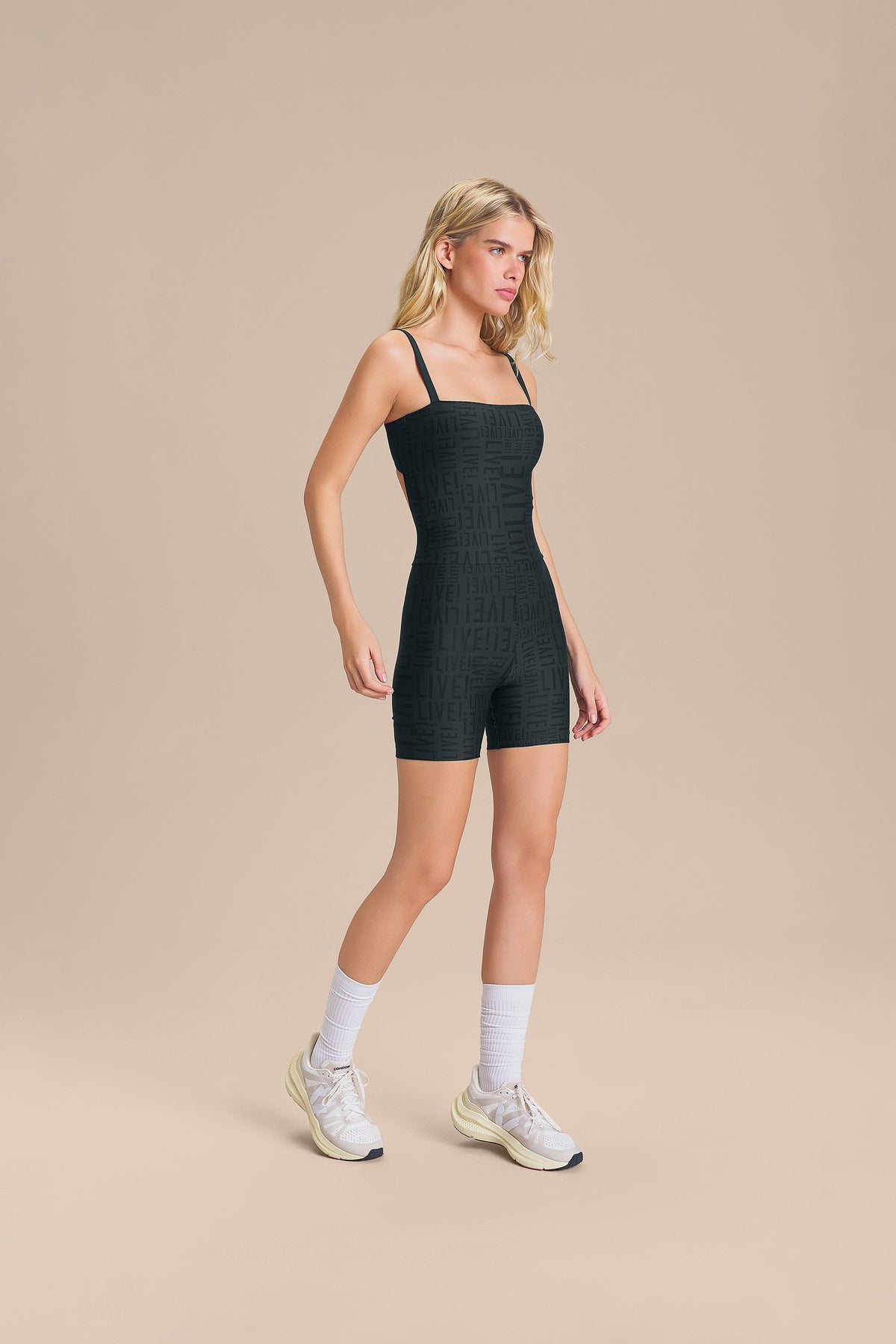 The LIVE! Shorts Jumpsuit is designed for light to moderate workouts including gym, full body training, running, and walking. Featuring thin straps and an elongated back opening, it enhances the silhouette with a modern look. Removable pads, accessible through a small internal opening, add convenience for everyday wear. Made from medium-compression fabric with a soft touch and UV 50+ protection, it ensures a secure yet comfortable fit. Reflective LIVE! branding adds safety in low-light or nighttime activity. All colorways are lined in the upper portion, while light-colored versions also include hip lining for zero transparency.